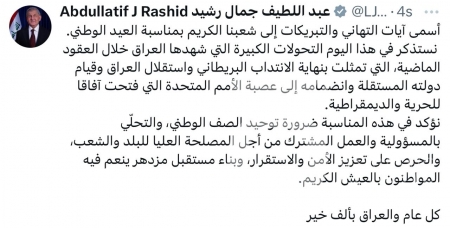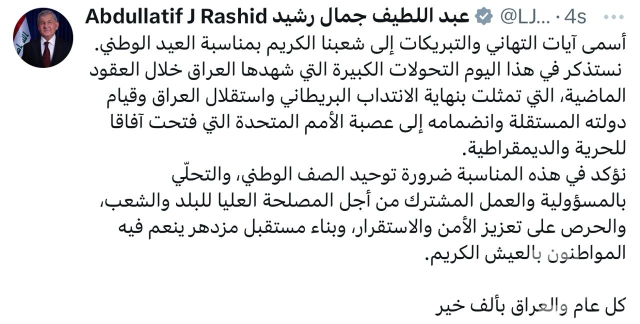 وجّه رئيس الجمهورية، عبد اللطيف جمال رشيد، أسمى آيات التهاني والتبريكات إلى أبناء الشعب العراقي الكريم بمناسبة العيد الوطني، مؤكداً أن هذه المناسبة تمثل محطة مهمة في تاريخ العراق المعاصر.