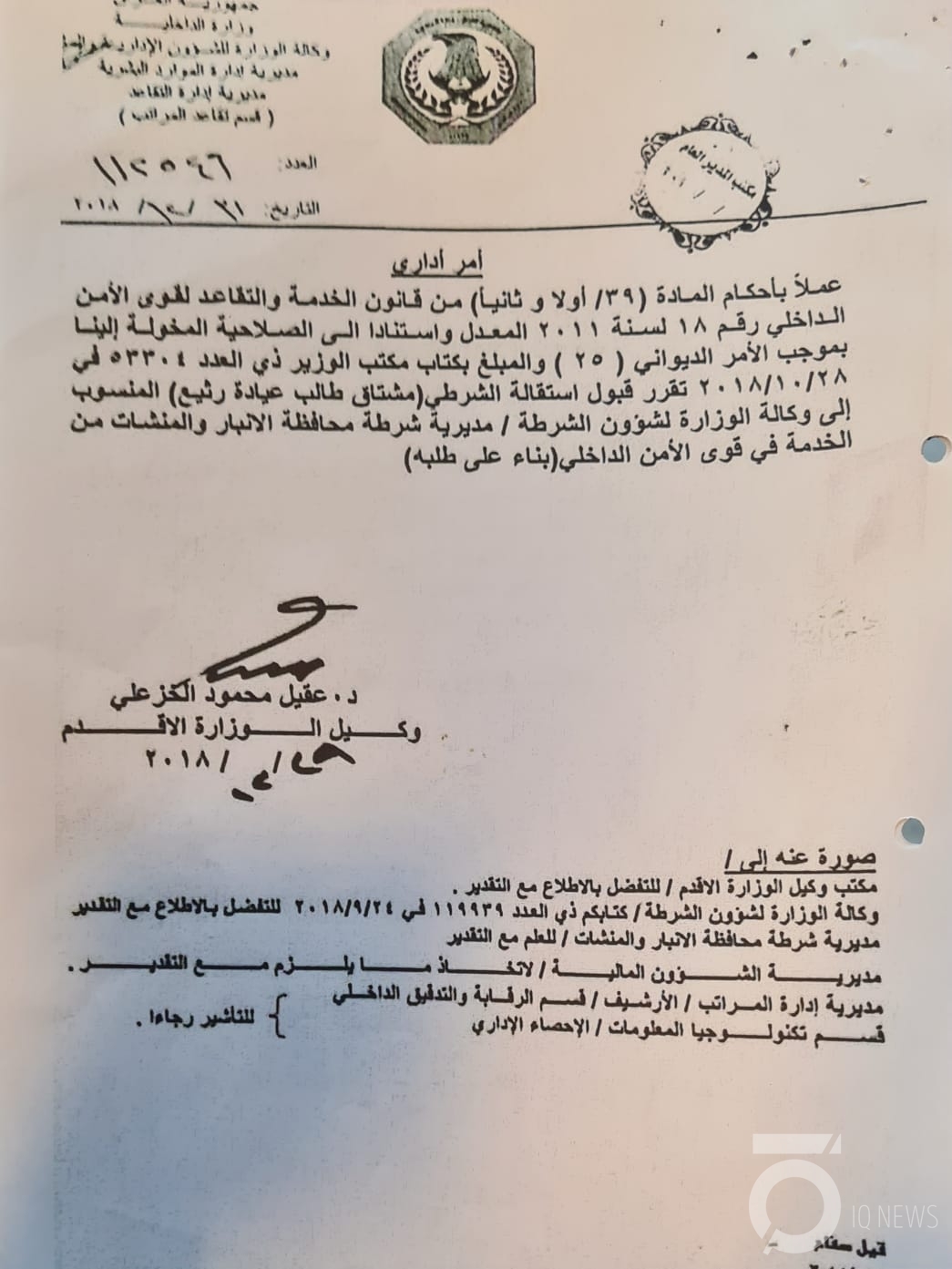 وبحسب وثيقة رسمية صادرة عن وزارة الداخلية عام 2018، فإن عيادة كان يشغل منصب شرطي في مديرية شرطة الأنبار قبل أن يتقدم باستقالته من قوى الأمن الداخلي عام 2019.