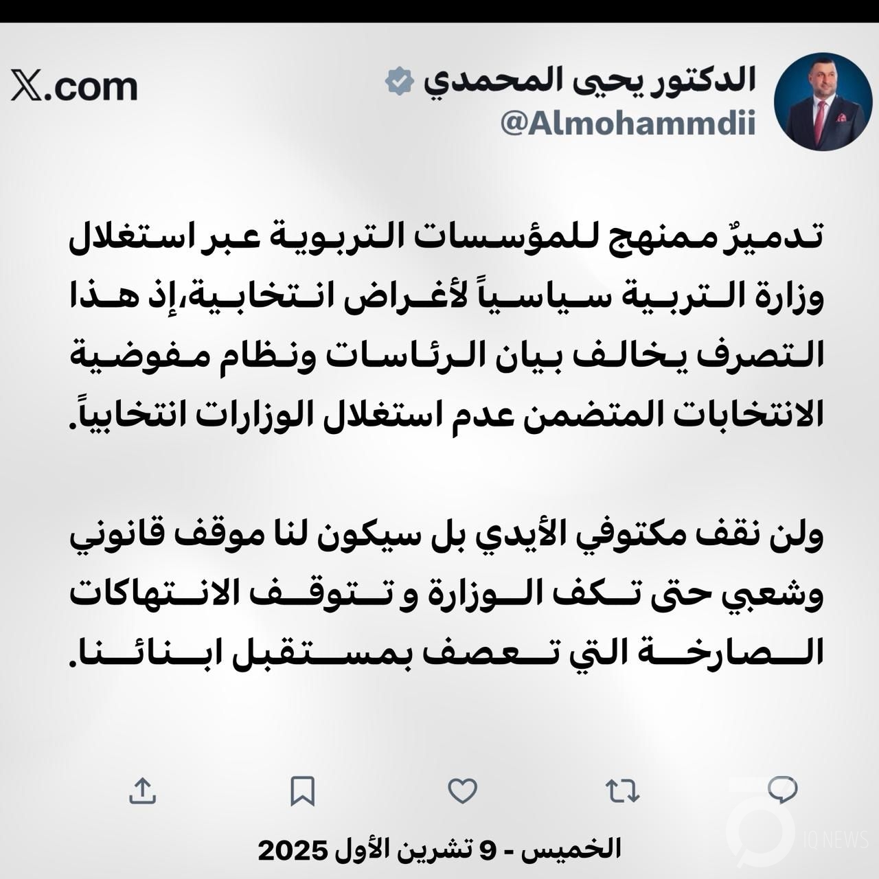 كشف النائب عن حزب تقدم يحيى المحمدي، اليوم الخميس، عن استغلال وزارة التربية لأغراض انتخابية، فيما أشار إلى اتخاذ موقف قانوني وشعبي.