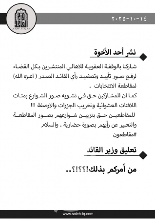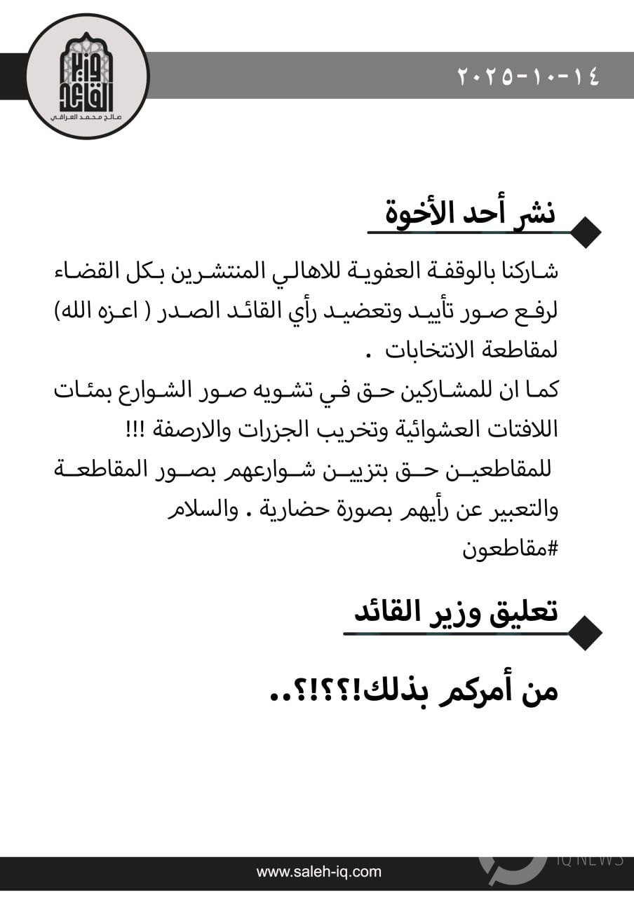 نشر صالح محمد العراقي الملقب بوزير زعيم التيار الصدري مقتدى الصدر، إجابته على سؤال بشأن نشر صور المقاطعة.