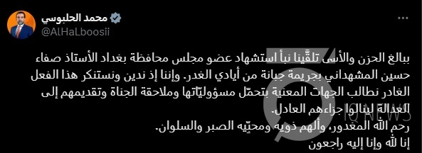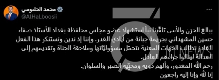 وقال الحلبوسي في تدوينة: "ببالغ الحزن والأسى تلقَّينا نبأ استشهاد عضو مجلس محافظة بغداد الأستاذ صفاء حسين المشهداني بجريمة جبانة من أيادي الغدر".