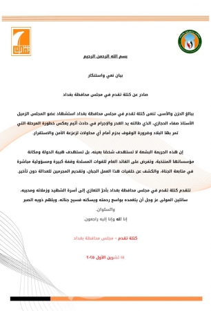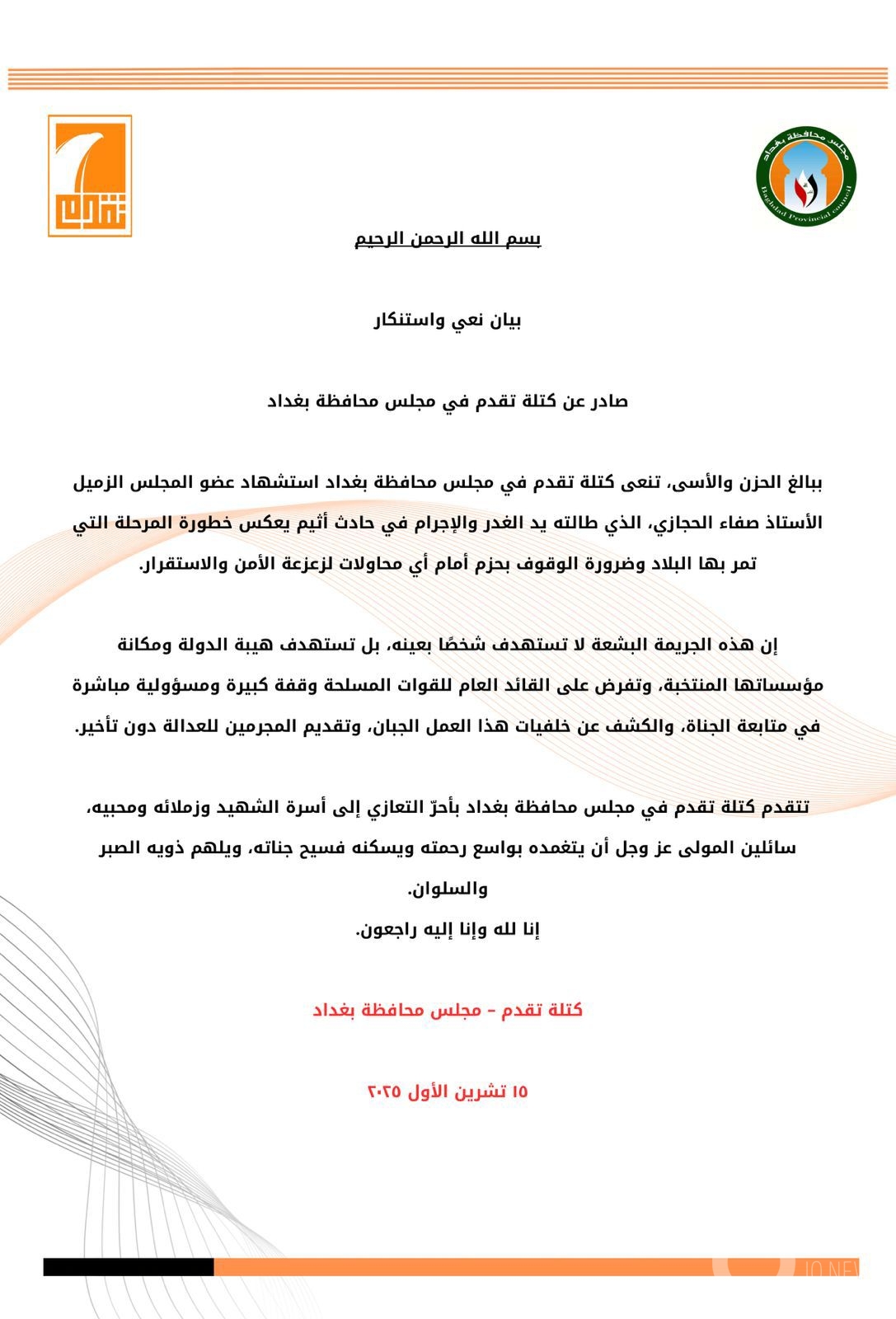 بغداد - IQ كتلة تقدم بمجلس بغداد عن اغتيال المشهداني: استهداف لهيبة الدولة ومكانة مؤسساتها