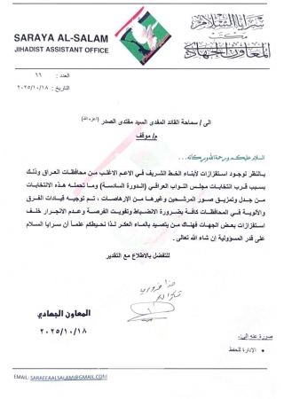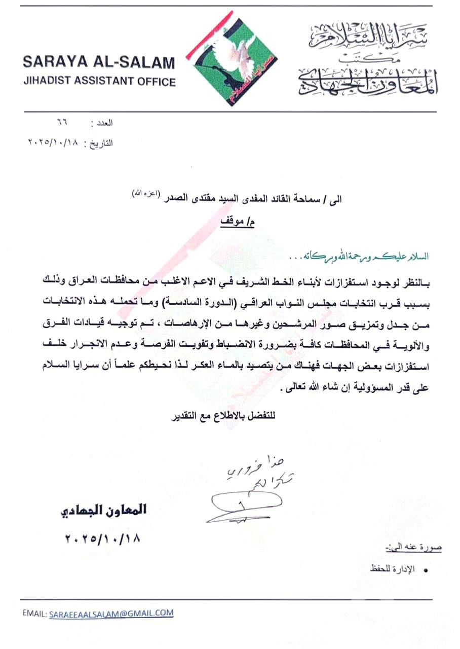 وجه زعيم التيار الوطني الشيعي مقتدى الصدر، سرايا السلام بالانضباط وعدم الانجرار خلف استفزازات بعض الجهات.
