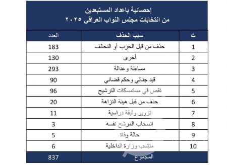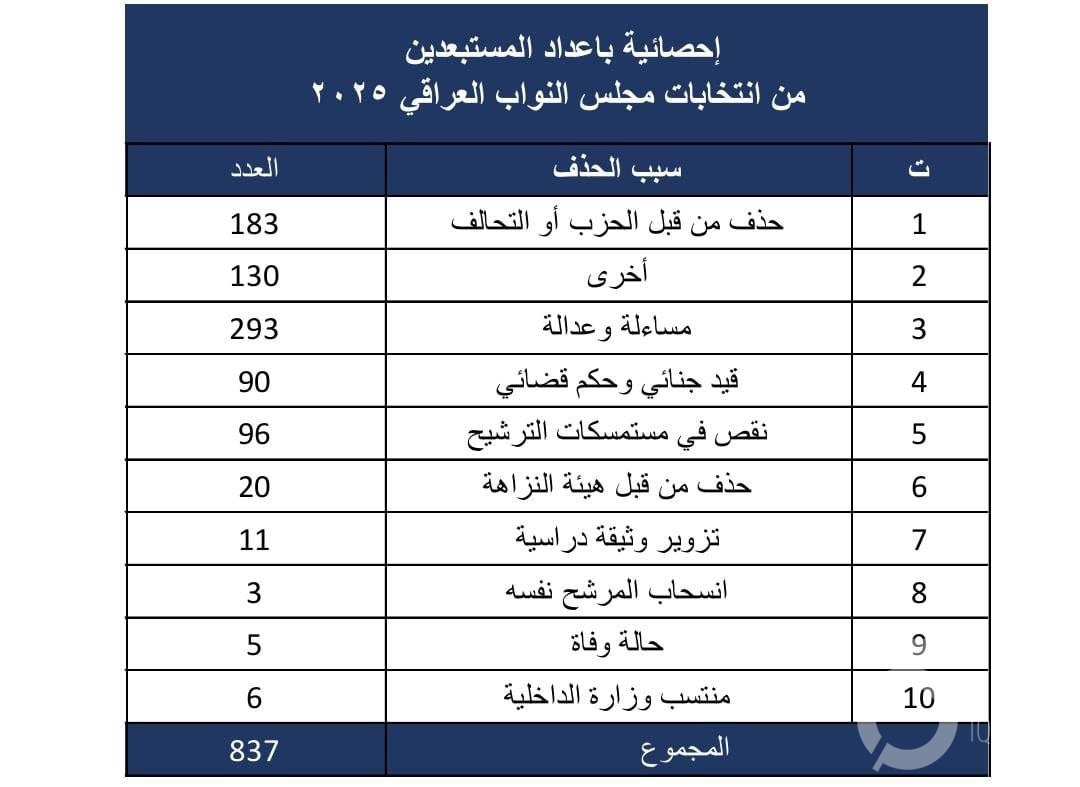 أعلنت مفوضية الانتخابات، اليوم السبت، استبعاد 837 مرشحاً من انتخابات مجلس النواب 2025.