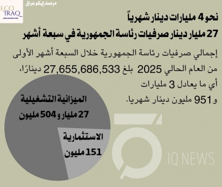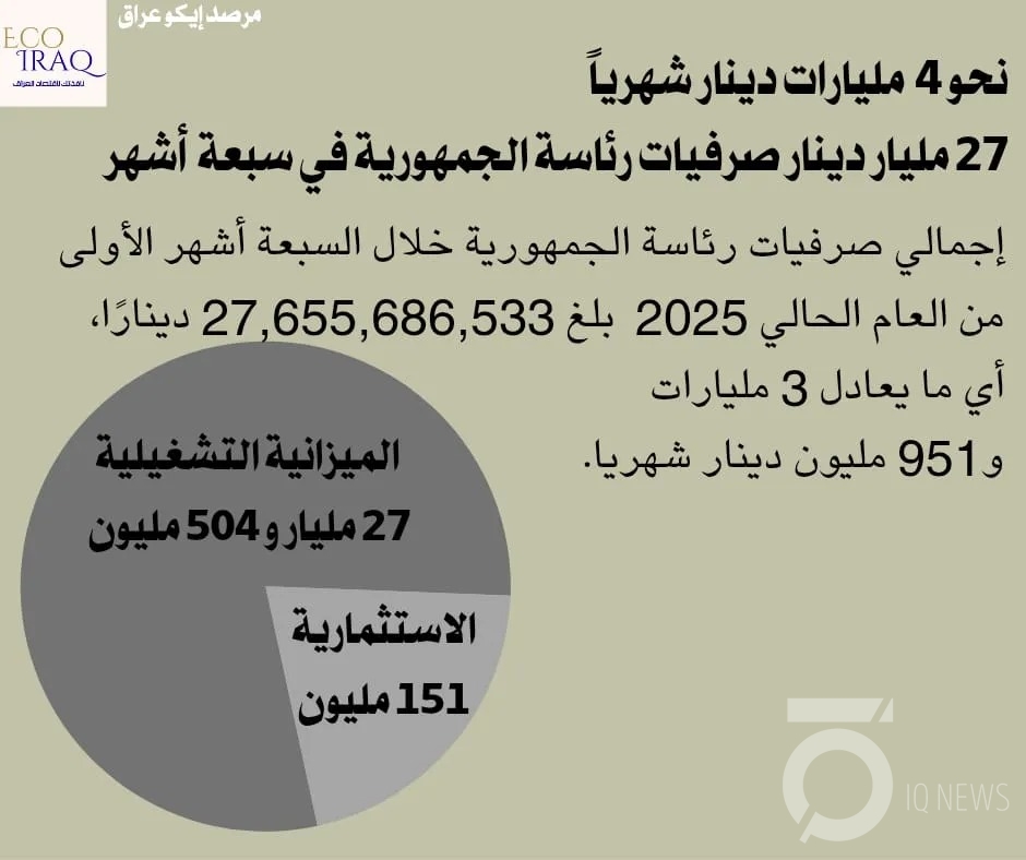 كشف مرصد "إيكو عراق"، يوم الثلاثاء، أن الصرفيات الفعلية لرئاسة الجمهورية بلغت نحو 4 مليارات دينار شهرياً، مشيراً إلى أن 99% منها تذهب للنفقات التشغيلية، بما في ذلك الرواتب والسفر والمستلزمات الإدارية والحماية، دون وجود أي نشاط تشريعي أو مشاريع تنفيذية بارزة.