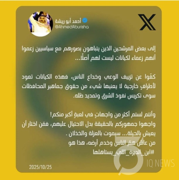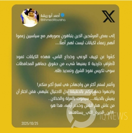 بغداد - IQ وجّه الشيخ أحمد أبو ريشة تحذيراً لبعض المرشحين، قائلاً: "كفّوا عن تزييف الوعي وخداع الناس بكيانات تعود لأطراف خارجية".