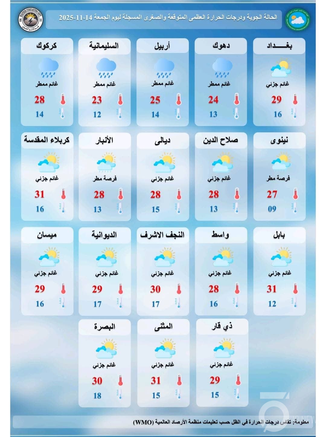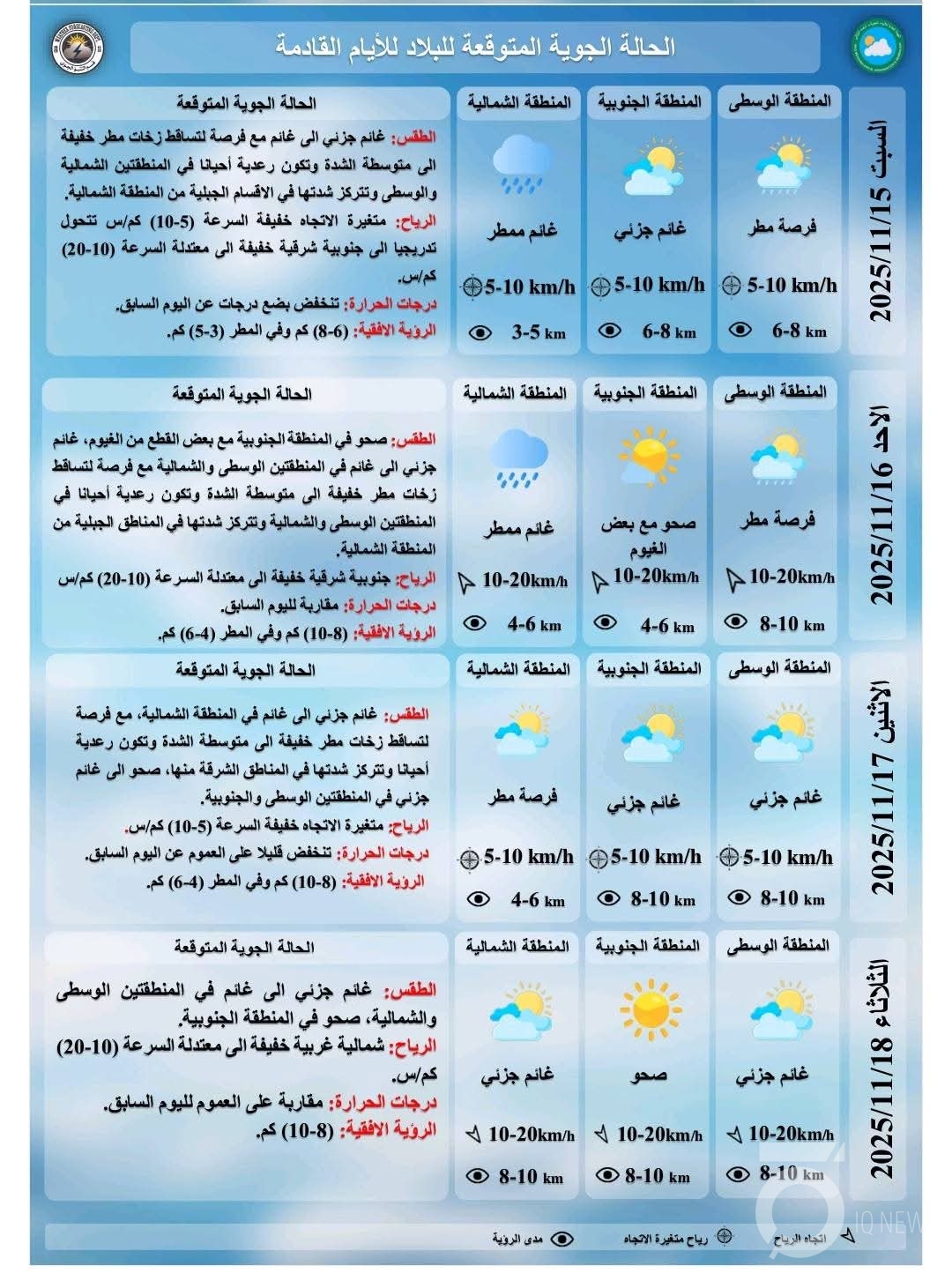 بغداد - IQ أعلنت هيئة الأنواء الجوية، اليوم الجمعة، عن تفاصيل حالة الطقس في البلاد للأيام المقبلة، فيما توقعت تساقطاً للأمطار الرعدية وانخفاضاً في درجات الحرارة.