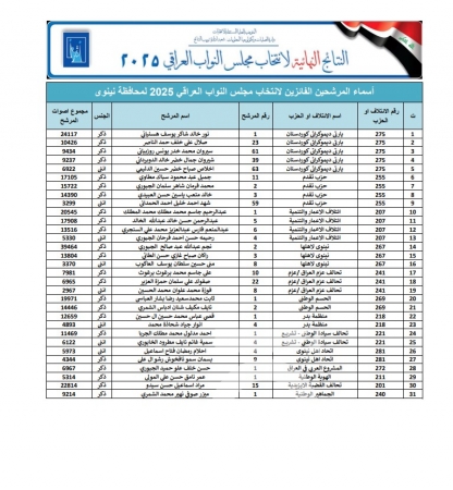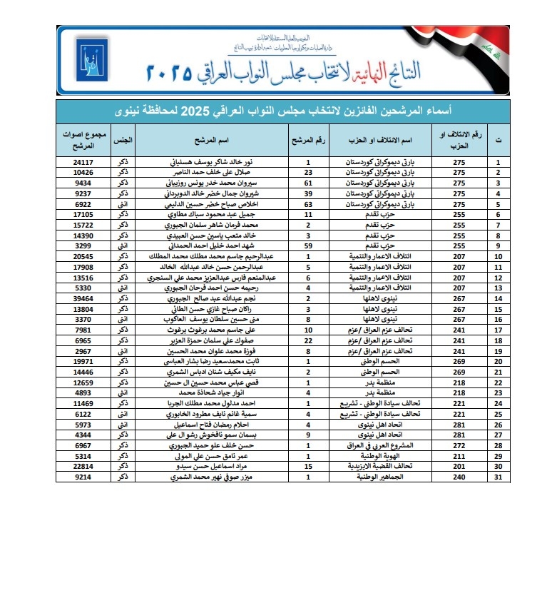 أعلنت المفوضية العليا المستقلة للانتخابات، عن أسماء الفائزين في الانتخابات النيابية عن محافظة نينوى.