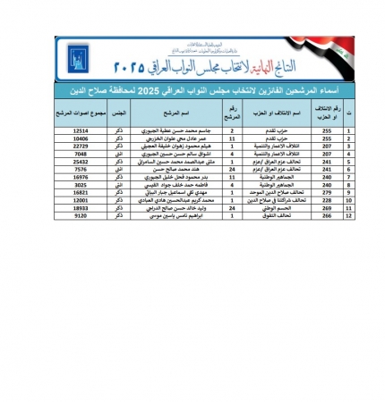 أعلنت المفوضية العليا المستقلة للانتخابات، عن أسماء الفائزين في الانتخابات النيابية عن محافظة صلاح الدين.