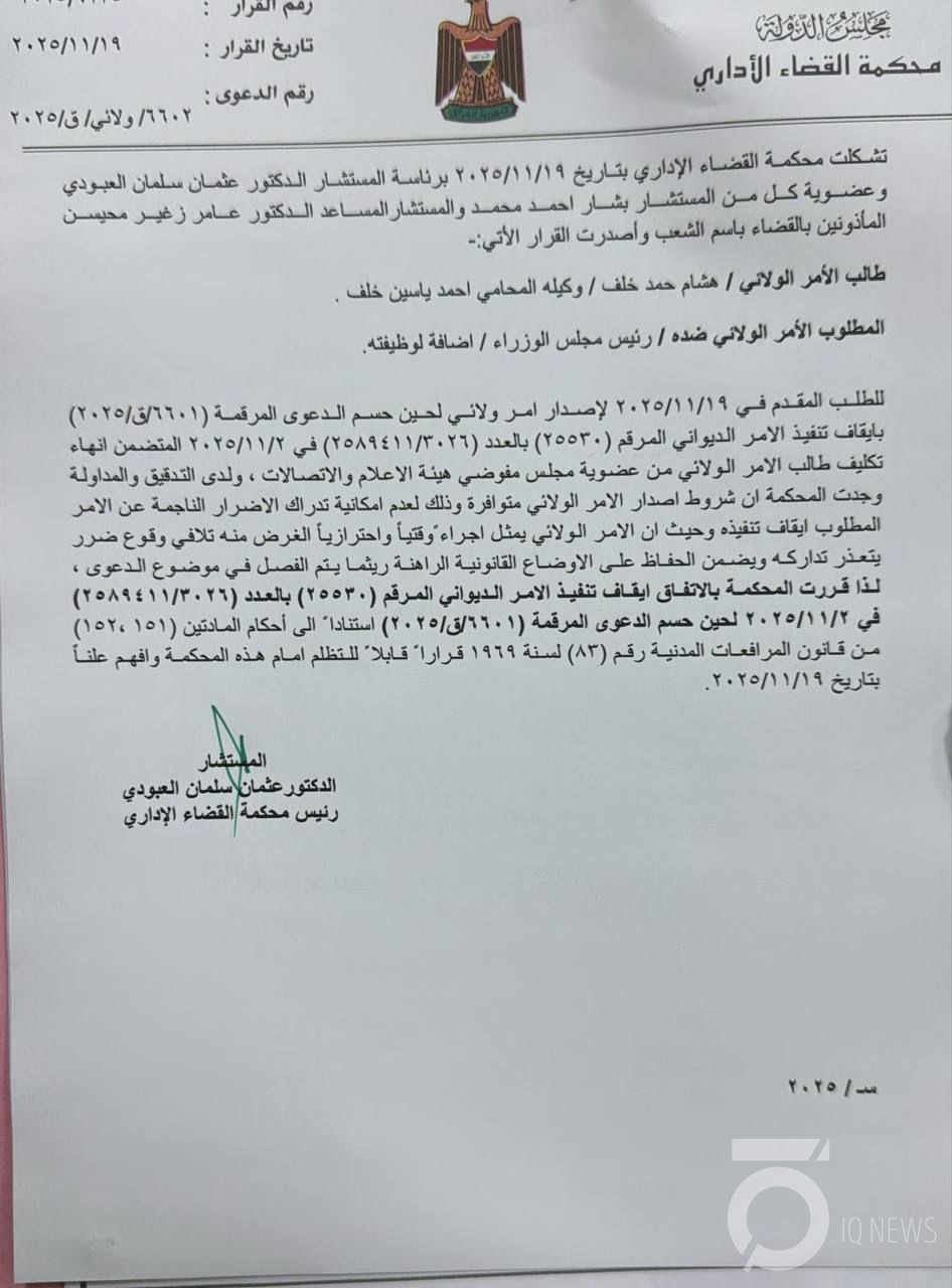 بغداد - IQ أصدرت محكمة القضاء الإداري، اليوم الأربعاء، امراً ولائياً بإيقاف إنهاء تكليف هشام الركابي من عضوية مجلس امناء هيئة الإعلام والاتصالات.