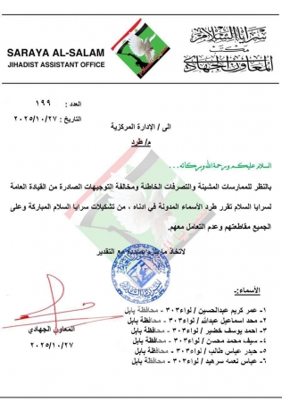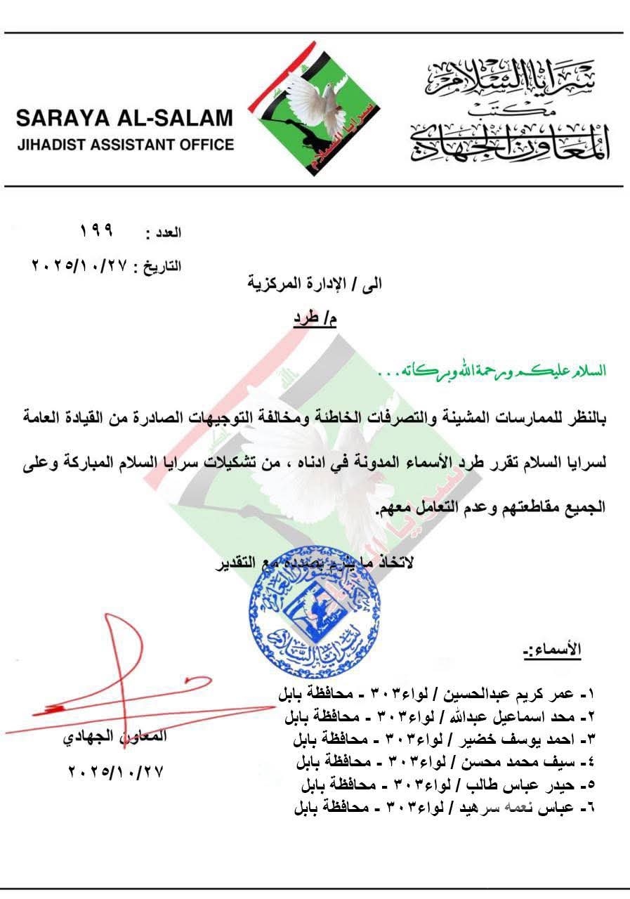 أعلنت سرايا السلام، طرد 6 من منتسبيها بسبب ما وصفته بممارسات مشينة وتصرفات خاطئة.