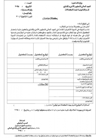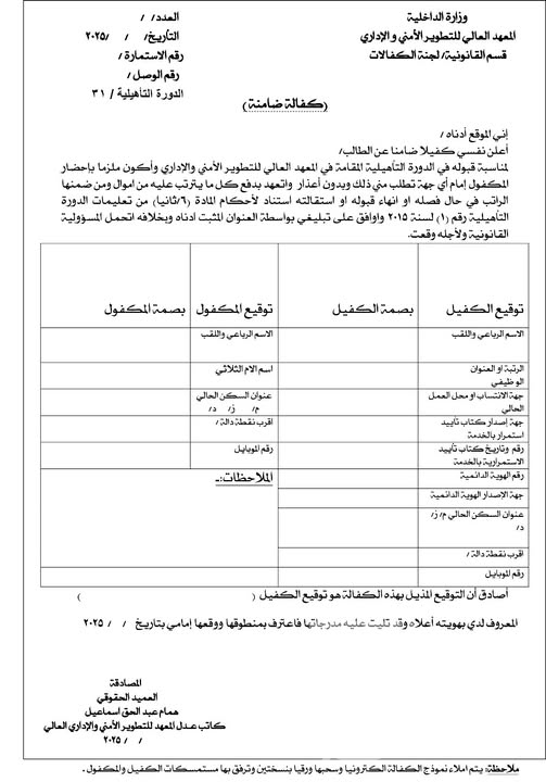 نرفق نموذج استمارة الكفيل الضامن للطالب المقبول على المعهد العالي وحسب ما مطلوب ادناه