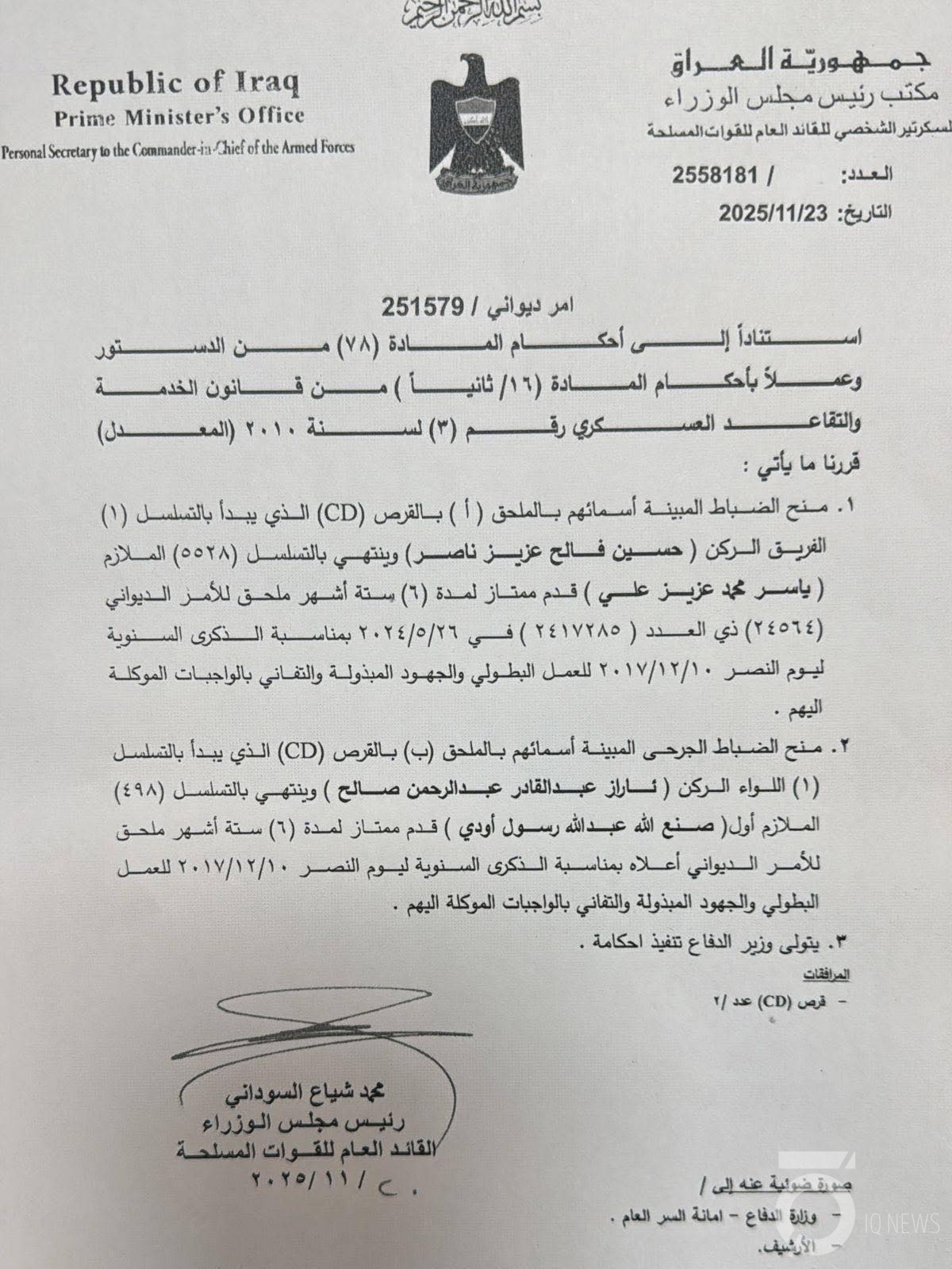 أصدر رئيس مجلس الوزراء محمد شياع السوداني، قدماً لمدة 6 أشهر لأكثر من 6000 ضابط.
