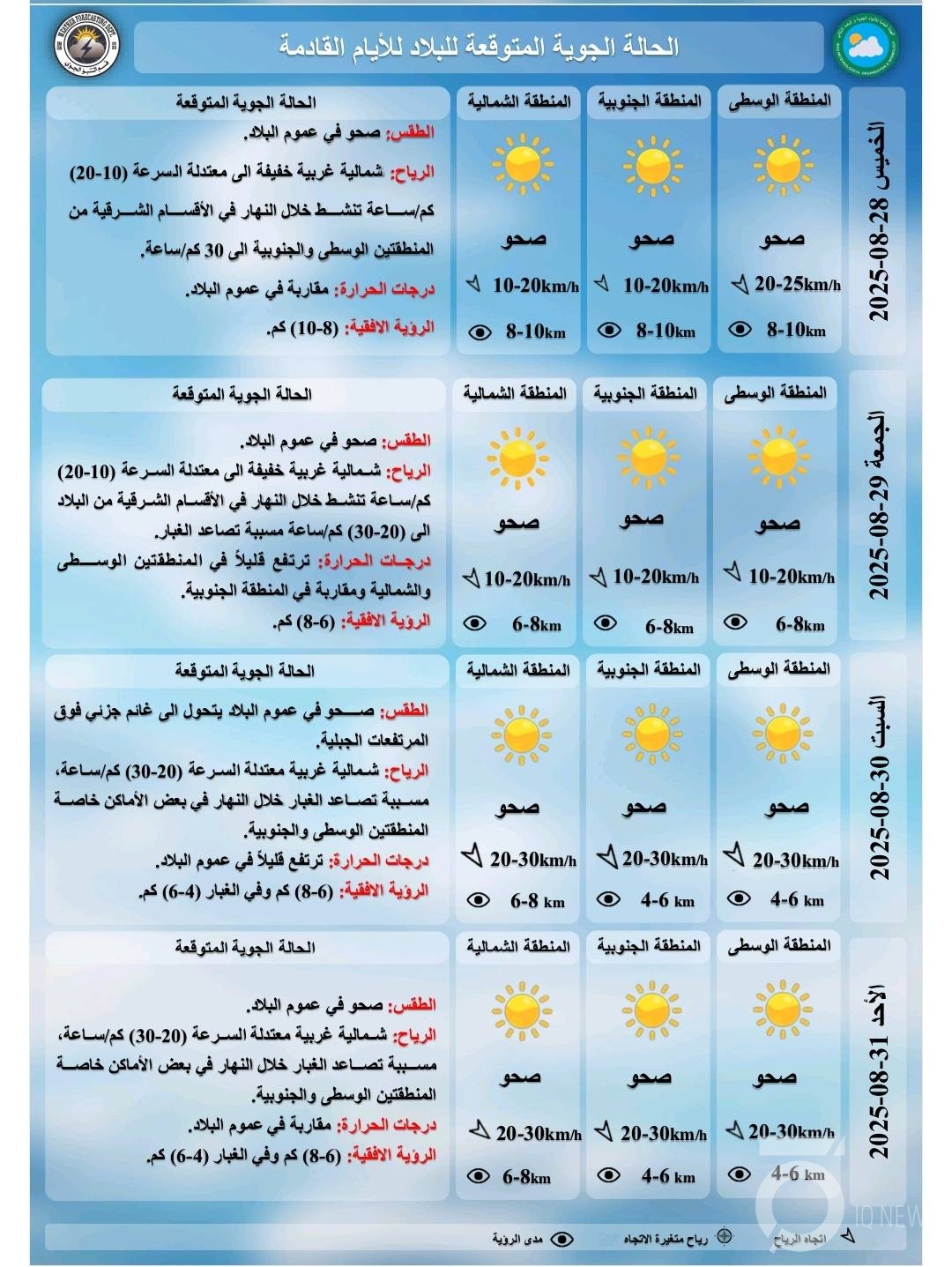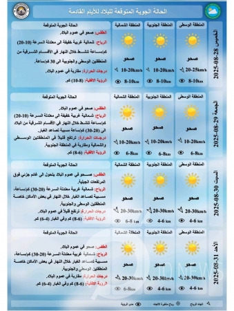 حالة الطقس حتى الثلاثاء المقبل: رياح نشطة تثير الغبار وارتفاع بدرجات الحرارة