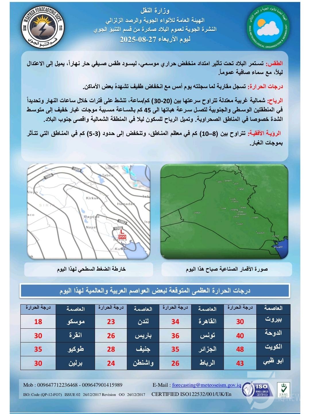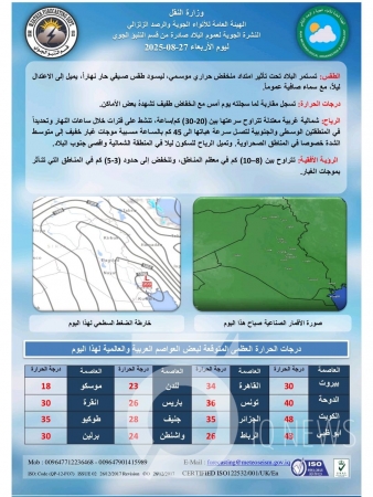 بغداد - IQ أعلنت هيئة الأنواء الجوية، اليوم الأربعاء، طقس العراق خلال الأيام المقبلة.