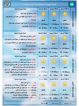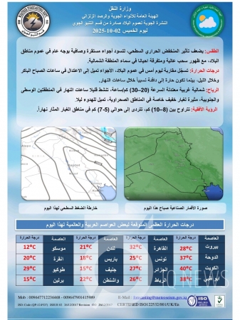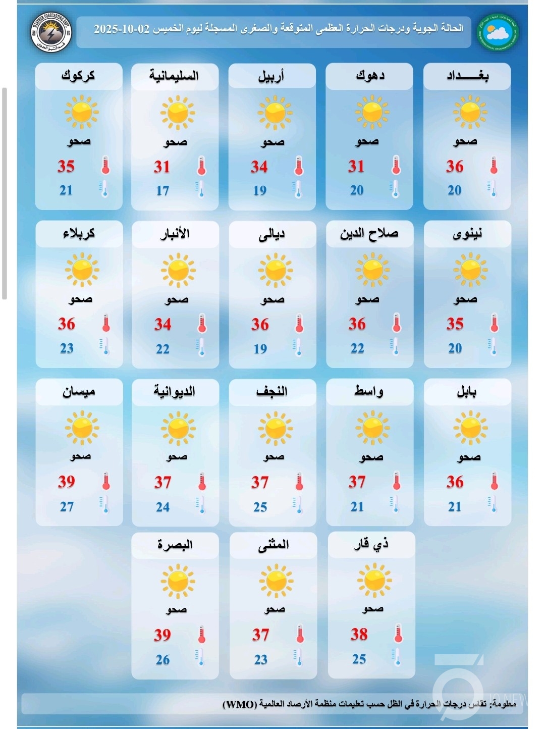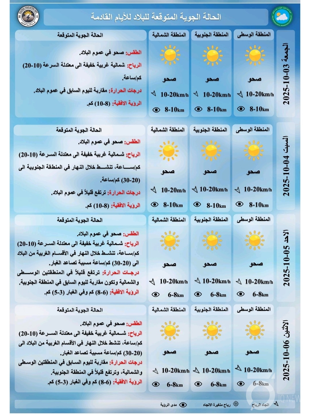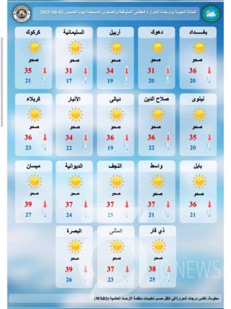 بغداد - IQ أعلنت هيئة الأنواء الجوية، اليوم الخميس، حالة طقس العراق خلال الأيام المقبلة.