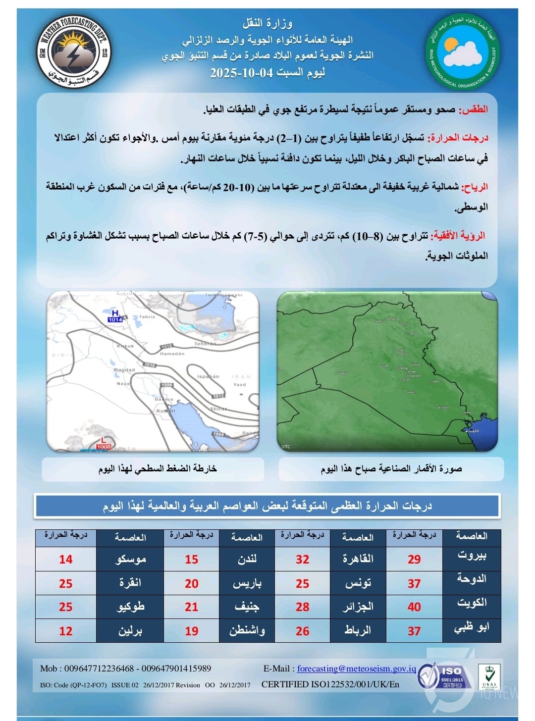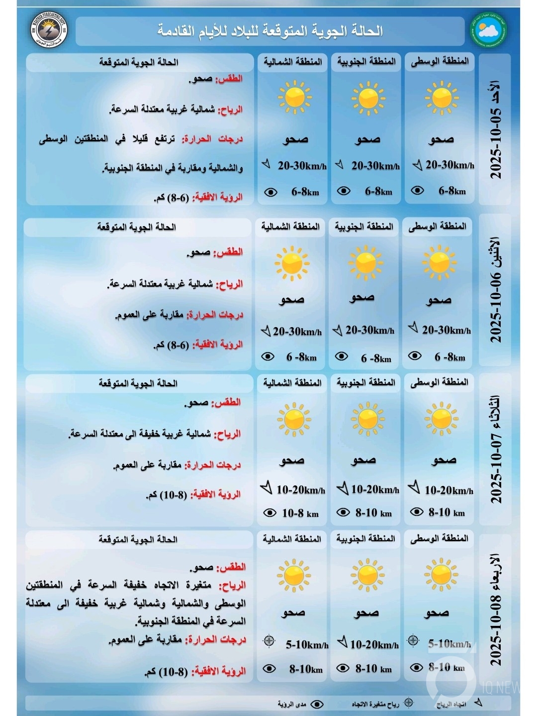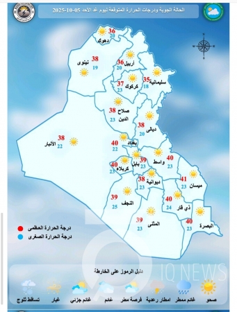 بغداد - IQ أعلنت هيئة الأنواء الجوية، اليوم السبت، حالة طقس العراق خلال الأيام المقبلة، فيما أشارت إلى عودة الحرارة الأربعينية إلى 6 محافظات.