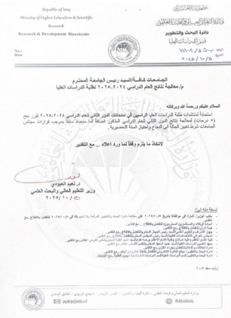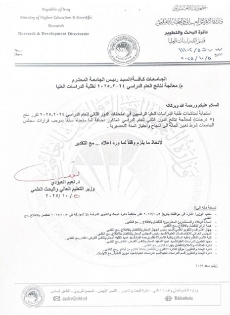 بغداد - IQ قررت وزارة التعليم العالي والبحث العلمي، اليوم الأحد، منح خمس درجات إضافية لطلبة الدراسات العليا الراسبين في الدور الثاني.