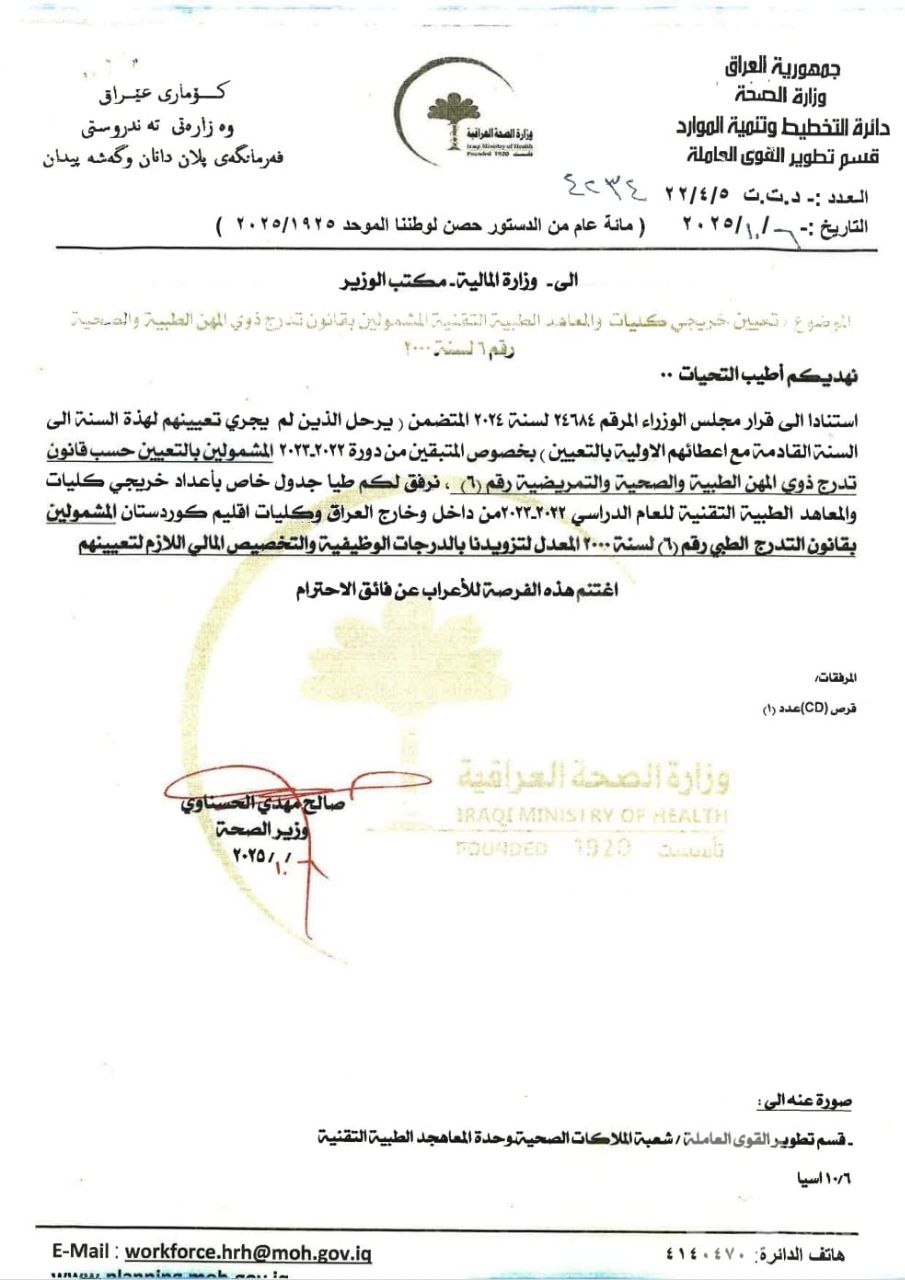 الصحة تدعم كوادرها بـ20 قرارا بينها مخصصات وقطع أراض