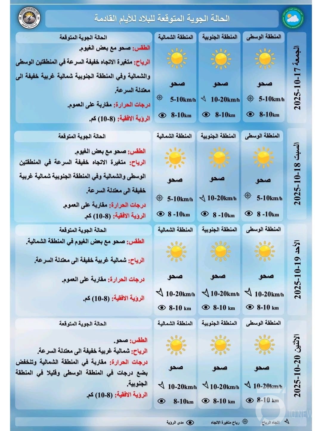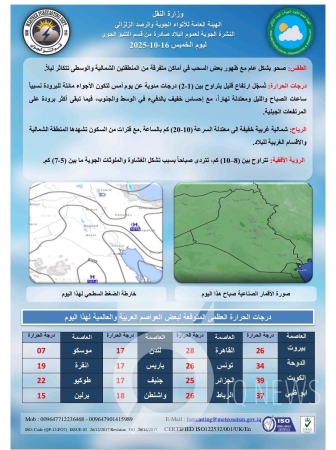 بغداد - IQ أعلنت هيئة الأنواء الجوية، حالة طقس العراق خلال الأيام المقبلة، فيما اشارت إلى أجواء مستقرة ودرجات حرارة ثلاثينية بأغلب المحافظات.