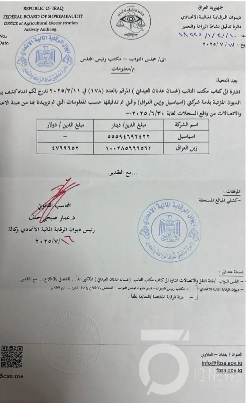 كشفت وثيقة صادرة عن ديوان الرقابة المالية، عن مجموع الديون المترتبة على شركتي الاتصالات "اسياسيل وزين العراق"، حيث تجاوزت الـ155 مليار دينار.