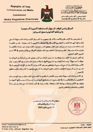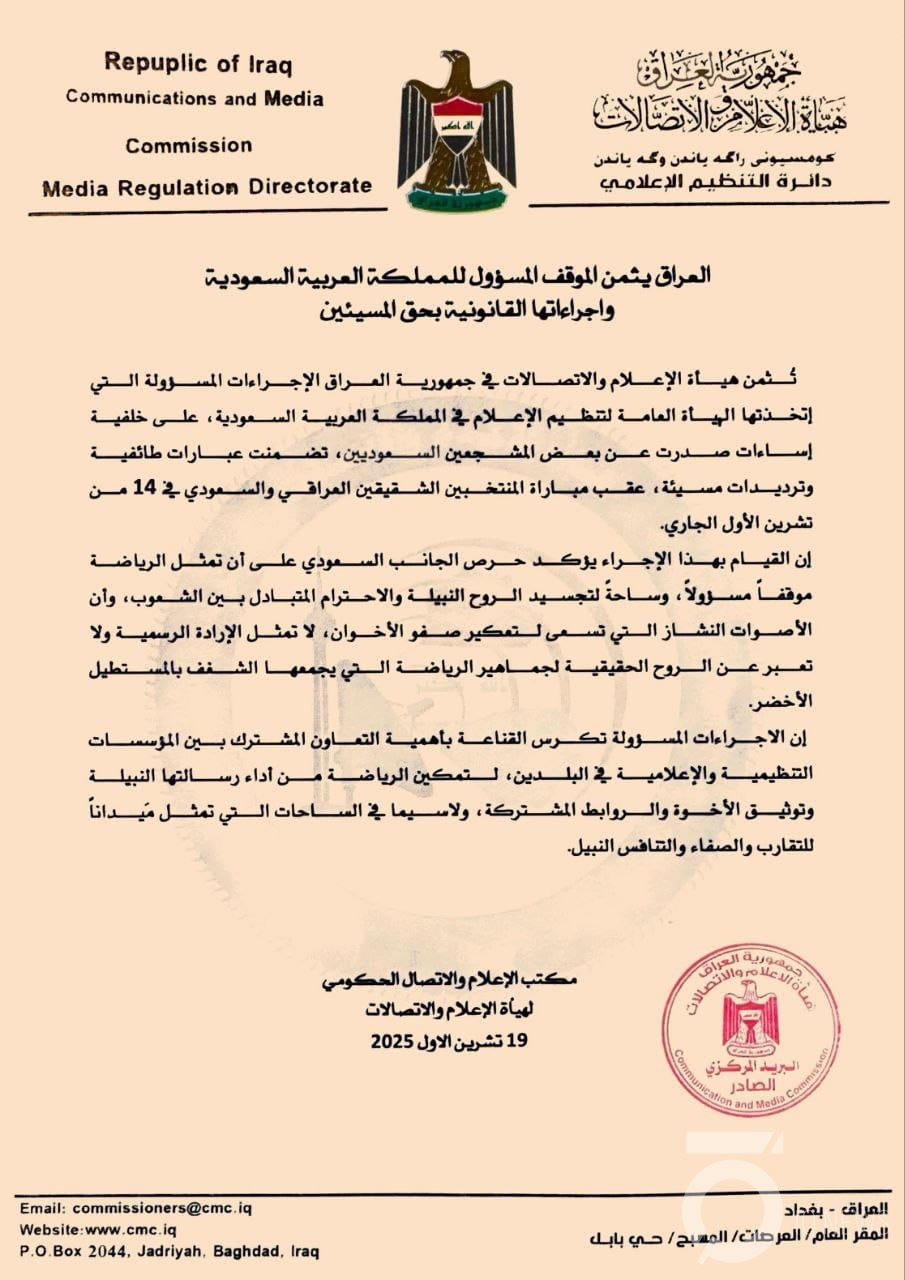 بغداد - IQ ثمنت هيئة الإعلام والاتصالات العراقية، اليوم الأحد، نظيرتها السعودية على إجراءاتها بحق بعض مشجعيها المسيئين.