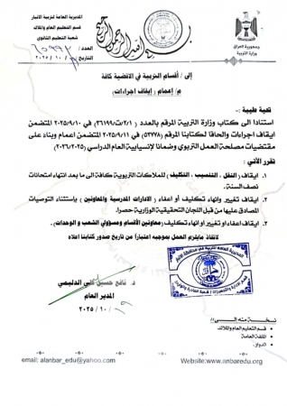 وتحمل الوثيقة توقيع الدليمي وختم المديرية، وتتضمن توجيهاً إلى أقسام التربية في الأقضية كافة بخصوص إيقاف إجراءات النقل والتنسيب والتكليف للملاكات التربوية إلى ما بعد انتهاء امتحانات نصف السنة الدراسية، إضافة إلى إيقاف إصدار أو إنهاء تكليفات جديدة باستثناء التوصيات المعتمدة من الوزارة.