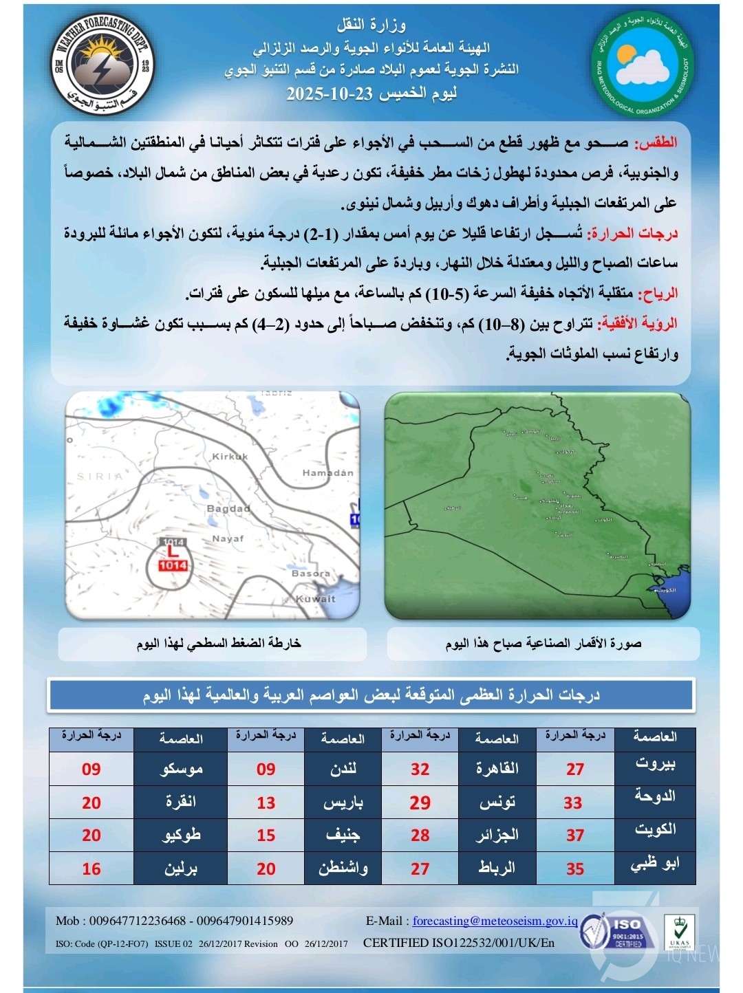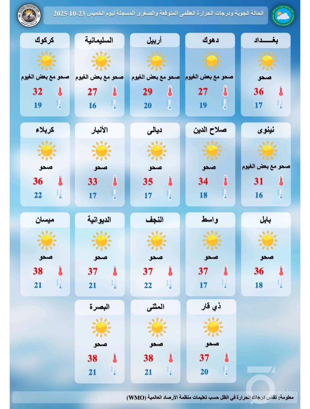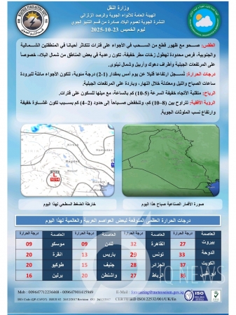 بغداد - IQ أعلنت هيئة الأنواء الجوية، اليوم الخميس، حالة طقس العراق خلال الأيام المقبلة، فيما أشارت إلى ارتفاع في نسب الملوثات الجوية.