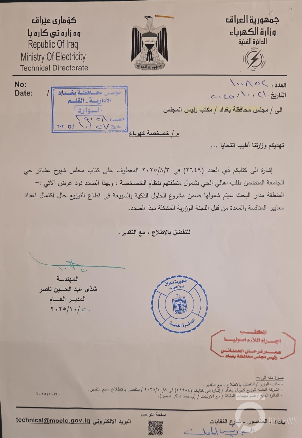 استجابت وزارة الكهرباء، لطلب رئيس مجلس بغداد عمار الحمداني بشمول حي الجامعة بـ"نظام الخصخصة".