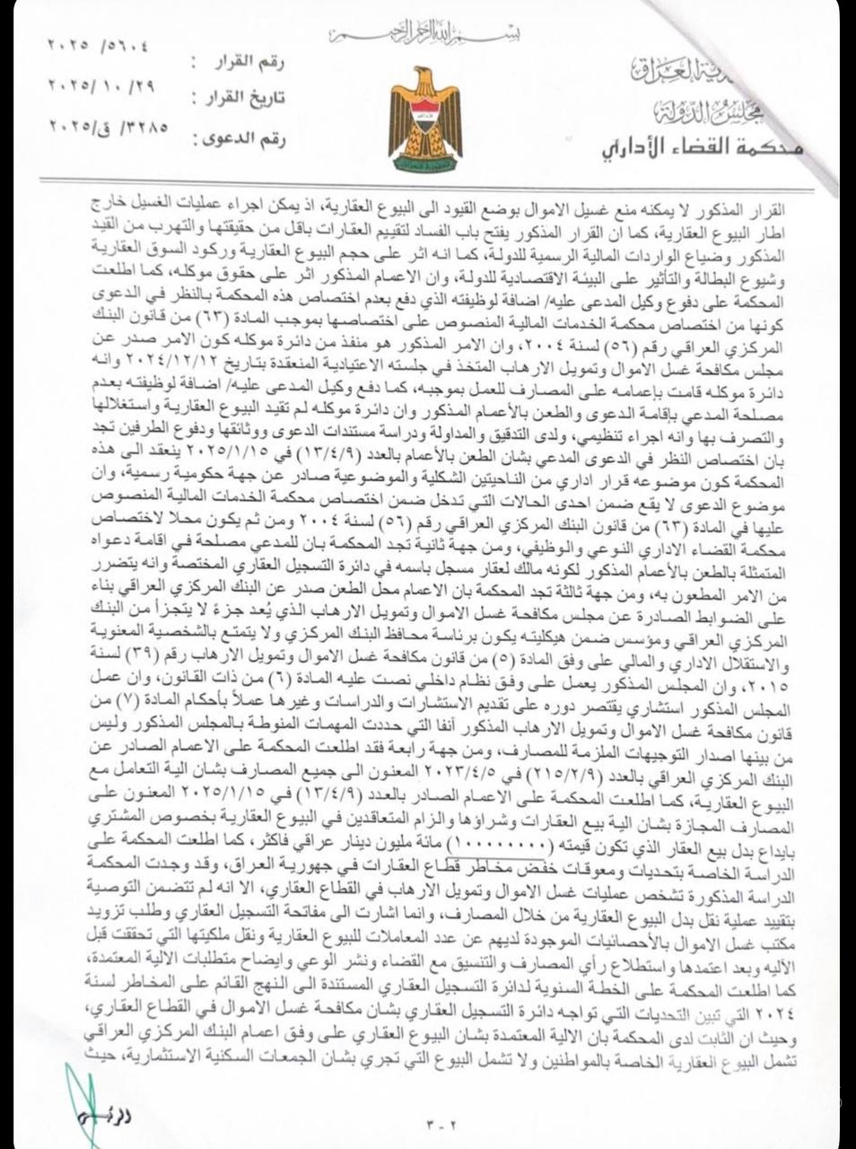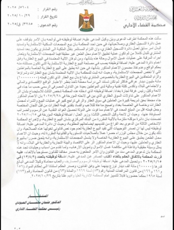 بغداد - IQ قررت محكمة القضاء الإداري، اليوم الأحد، إلزام البنك المركزي بإيداع بدلات بيع العقارات فوق 100 مليون دينار.