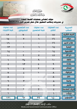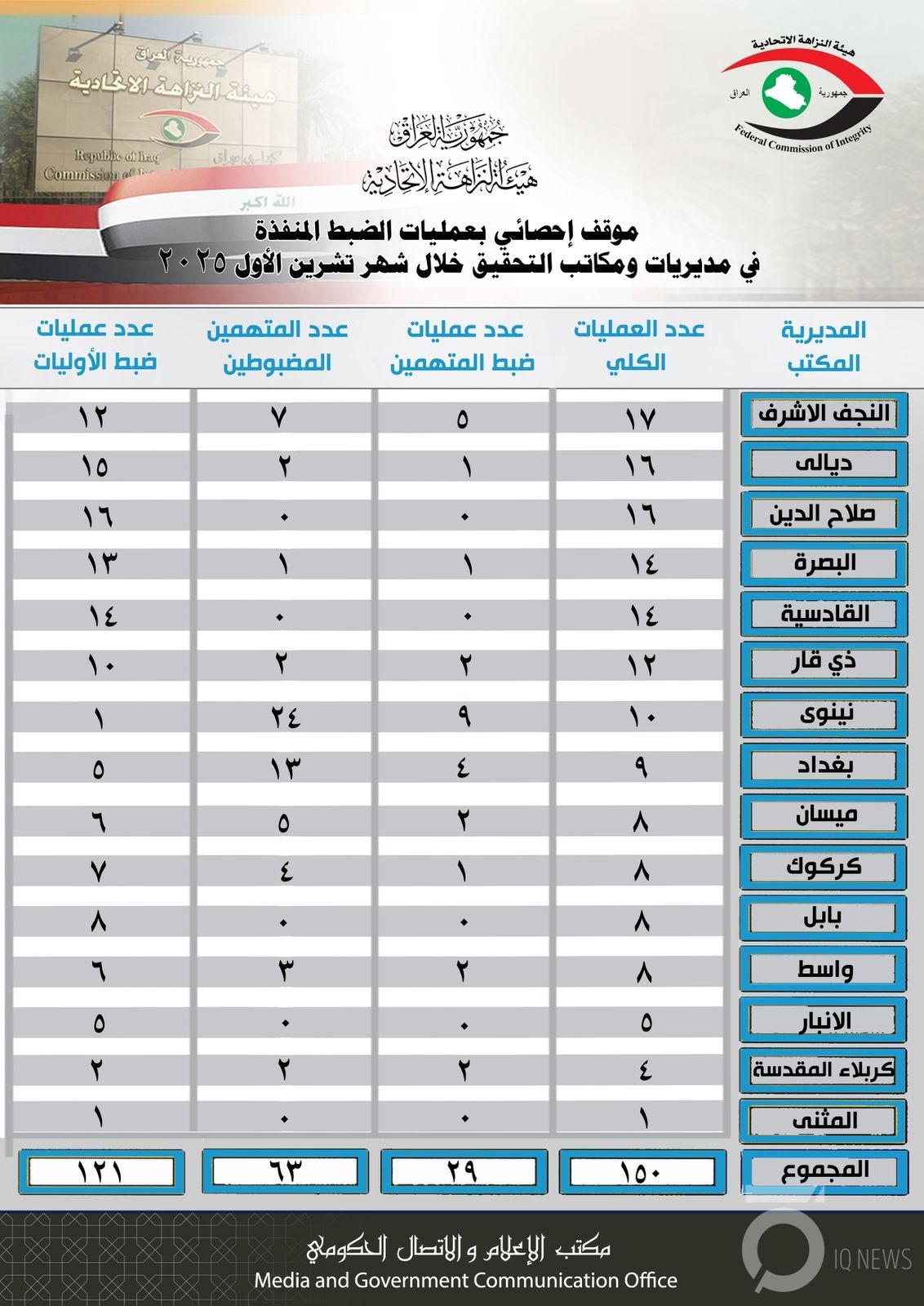 بغداد - IQ أعلنت هيئة النزاهة، اليوم الأحد، ضبط 63 متهماً خلال الشهر الماضي.