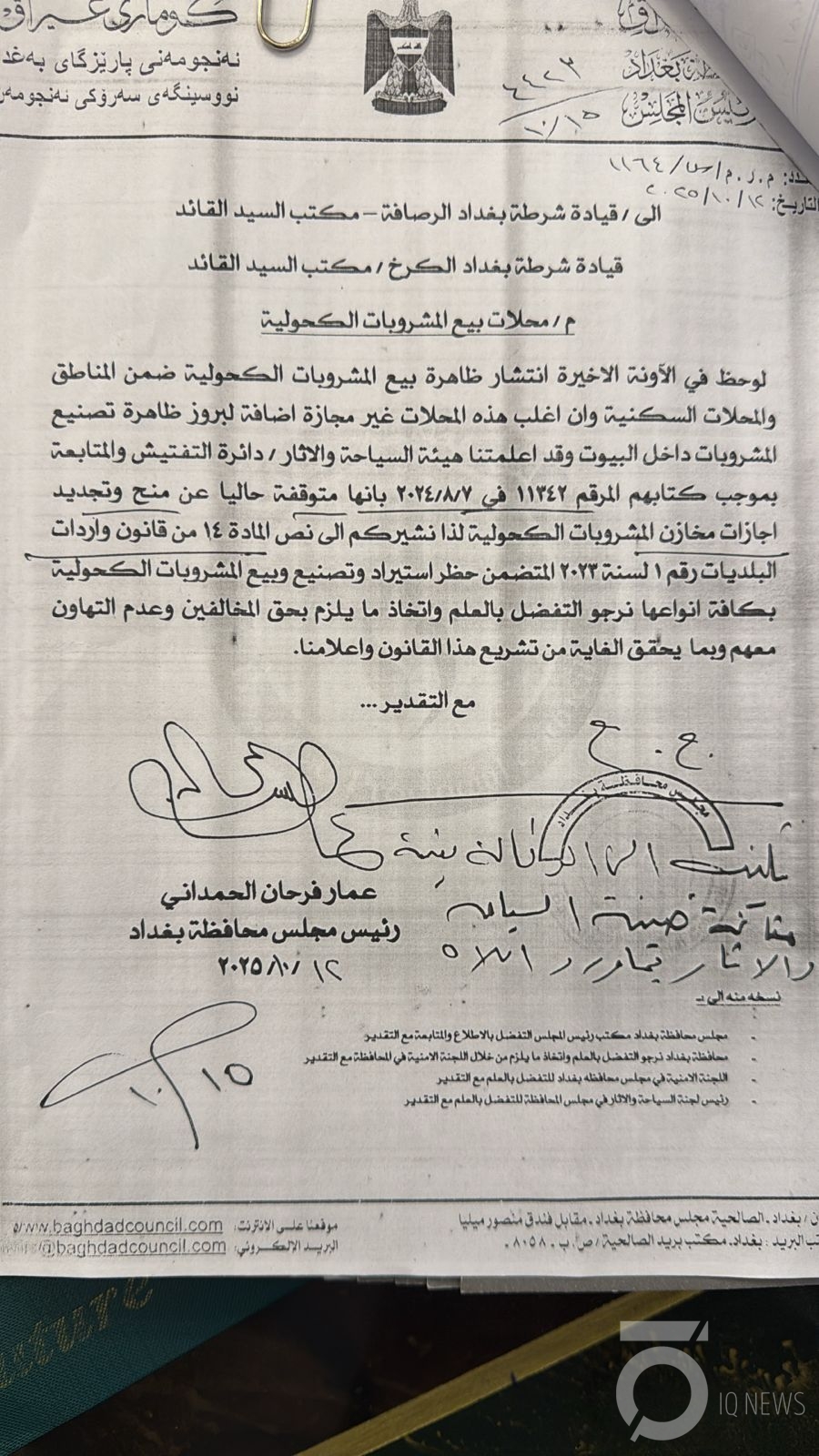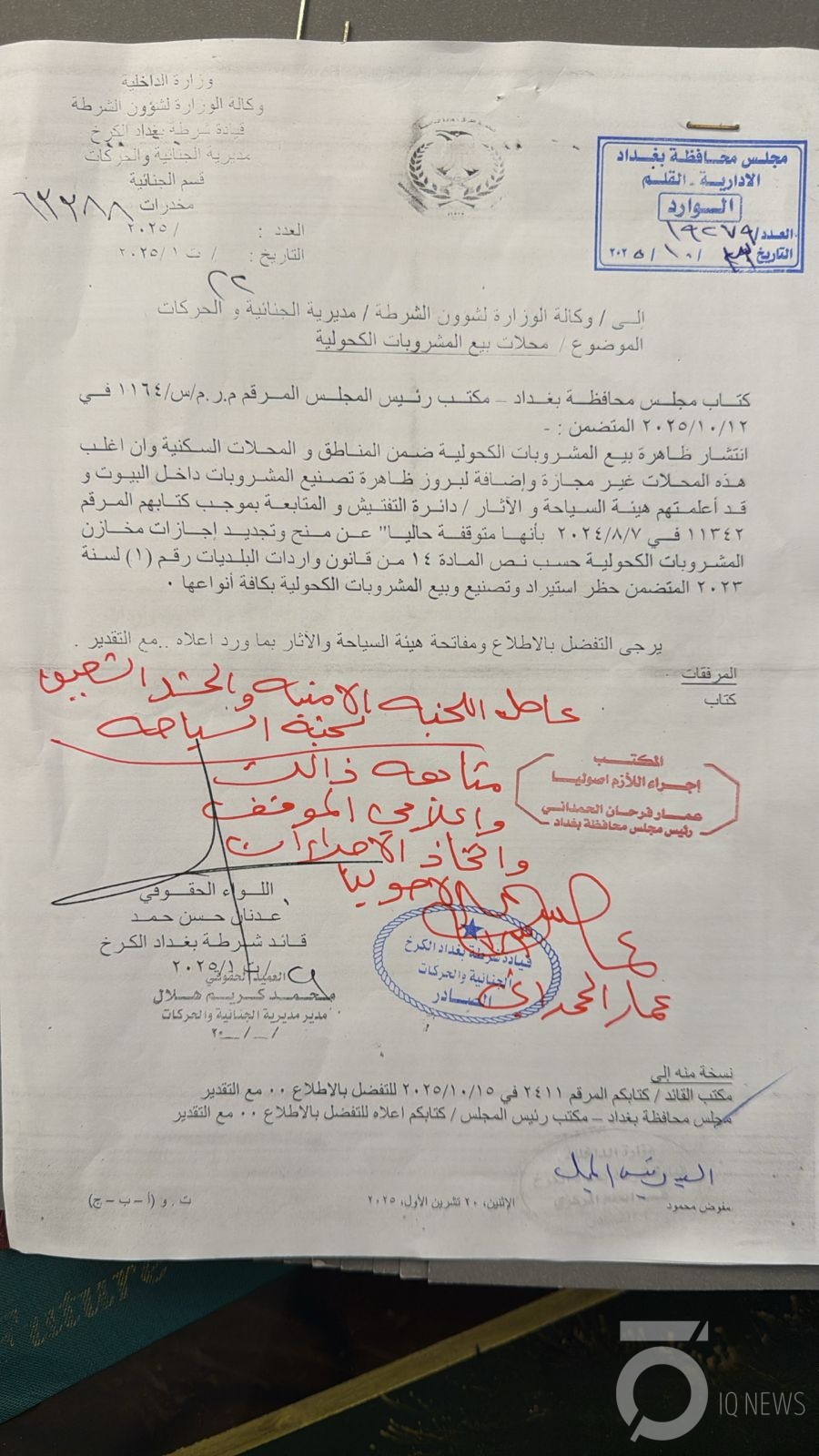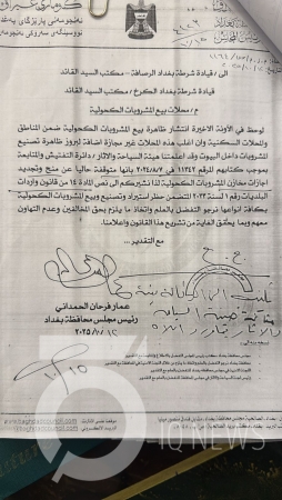 وجه قائد شرطة الكرخ اللواء عدنان حسن حمد، بملاحقة المتورطين ببيع وتصنيع المشروبات الكحولية بالبيوت والمناطق السكنية استنادا إلى كتاب رئيس مجلس محافظة بغداد عمار الحمداني.