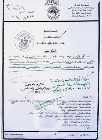 يُذكر أن هذا هو كتاب الشكر والتقدير الرابع الذي يوجهه وزير التعليم إلى جامعة الأنبار خلال عام 2025، مما يعكس الجهود الحثيثة للقائمين عليها بهدف وضعها في مصافِ الجامعات العراقية والعربية والعالمية، تأكيداً على مكانتها المرموقة ضمن منظومة التعليم العالي في العراق.