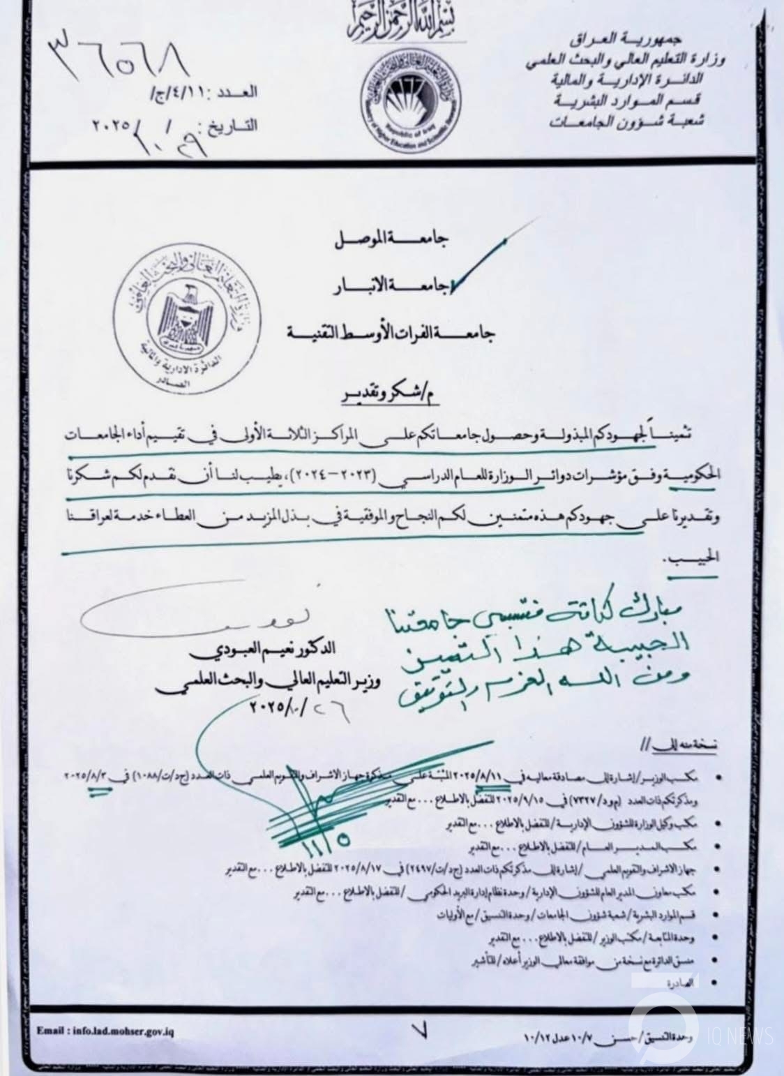وأكد العبودي في كتابه أن هذا الإنجاز يعكس مستوى الأداء المتقدم والالتزام العالي بمعايير الجودة والتميز الأكاديمي والإداري في جامعة الأنبار، مشيداً بما حققته الجامعة من تطور واضح في مختلف المجالات.