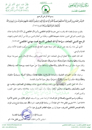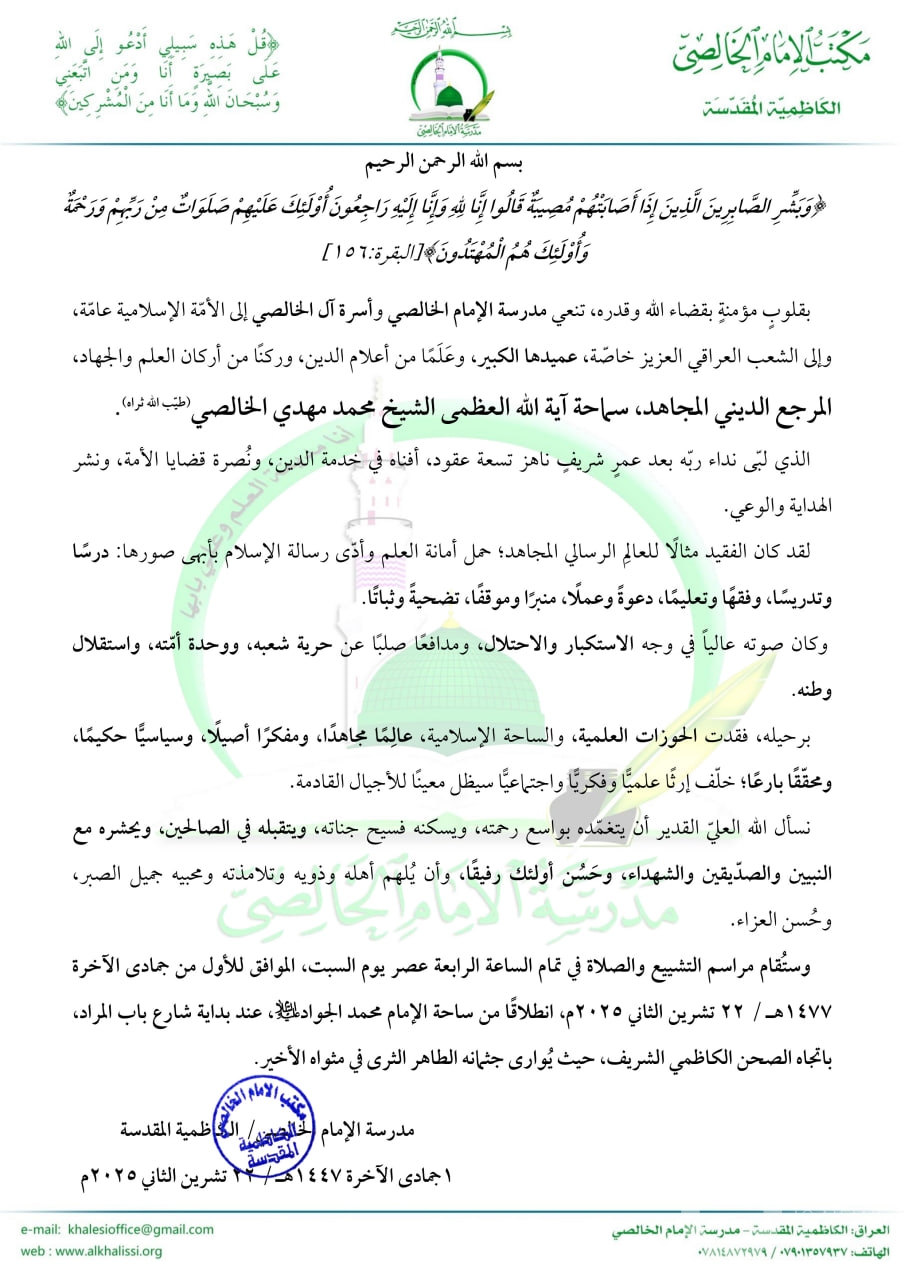 بغداد - IQ أعلنت مدرسة الخالصي في الكاظمية المقدسة، اليوم السبت، رحيل عميدها محمد مهدي الخالصي.