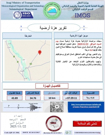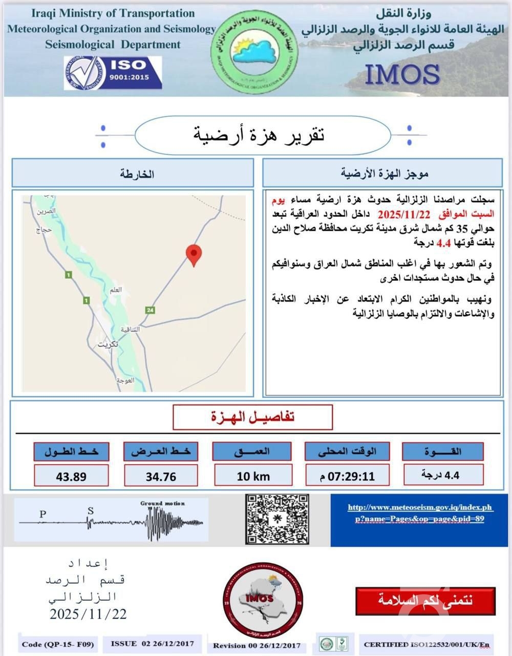 أعلنت هيئة الأنواء الجوية، حدوث هزة أرضية بلغت قوتها (4.4) درجات قرب محافظة صلاح الدين.